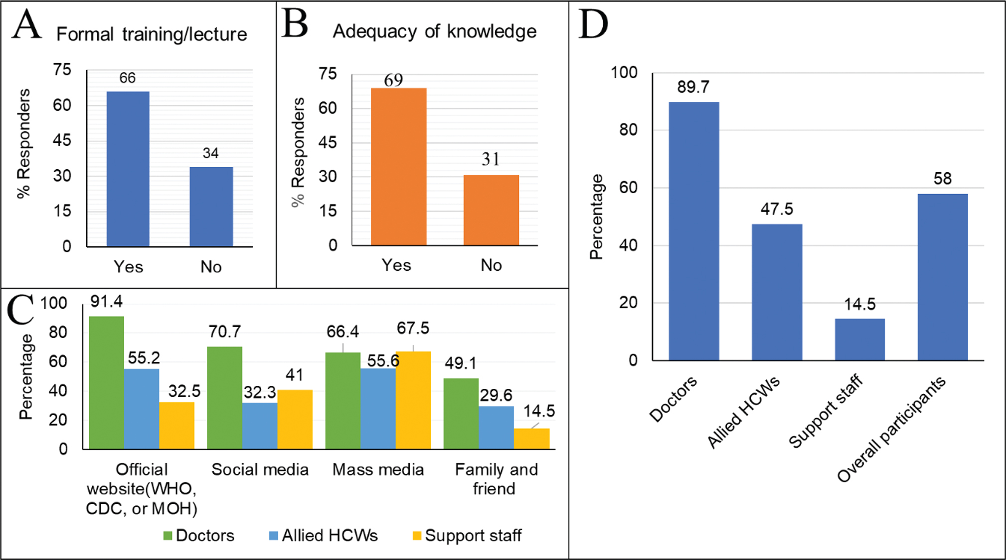 Fig. 1. Knowledge and sources of COVID-19 information among participants. (a) Formal training about COVID-19. (b) Adequacy of knowledge (self-assessment) among HCWs and support staff. (c) Sources of information about COVID-19. (d) Percentage of HCWs and support staff with adequate knowledge (score > 80%).