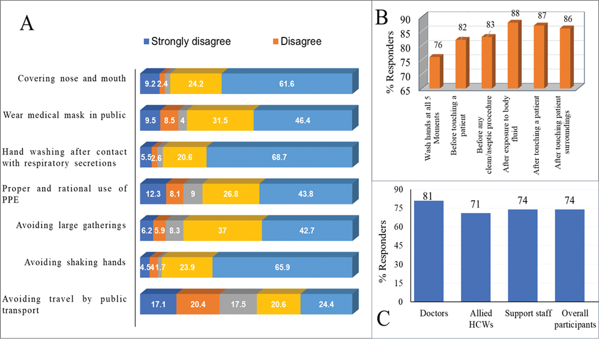 Fig. 2. Self-reported infection prevention and control practices for COVID-19. (a) Stacked bar in percentage of HCWs’ and support staffs’ responses to the practice questions (n = 422). (b) Percentage of HCWs’ reported handwashing practices for the WHO’s five moments of handwashing (n = 339). (c) The practice of preventive measures by the HCWs and support staff.
