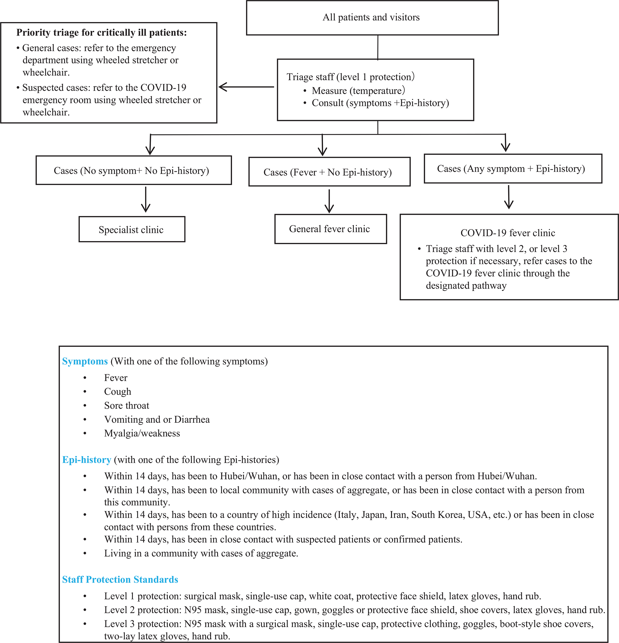 All triage staff were trained to learn and apply triage procedures; appropriate personal protection and protection levels based on all patients’ and visitors’ temperature, symptoms, and epidemiological history (Fig. 1); appropriate use of personal protective equipment; disinfection; and isolation. This was done using both online and offline training materials, including text and videos, administered in the form of both self-learning and guided training modules. The text part consists mainly of guidance documents such as diagnosis and treatment programs, protection and disposal processes, and prevention and control guides, while the videos are mostly operation videos of wearing and taking off isolation clothing and protective clothing, and patient care. Staff were permitted to work at triage points only after an intensive training on personal protection and infection prevention/control, and after a formal assessment and approval by hospital leadership. Head nurses or team leaders inspected triage points on daily basis to ensure that all staff followed the triage procedures and personal protection measures correctly. Studies have shown that staff training during infectious disease outbreaks is essential to improve awareness of self-protection and reduce the risk of infection of medical staff (11–15).