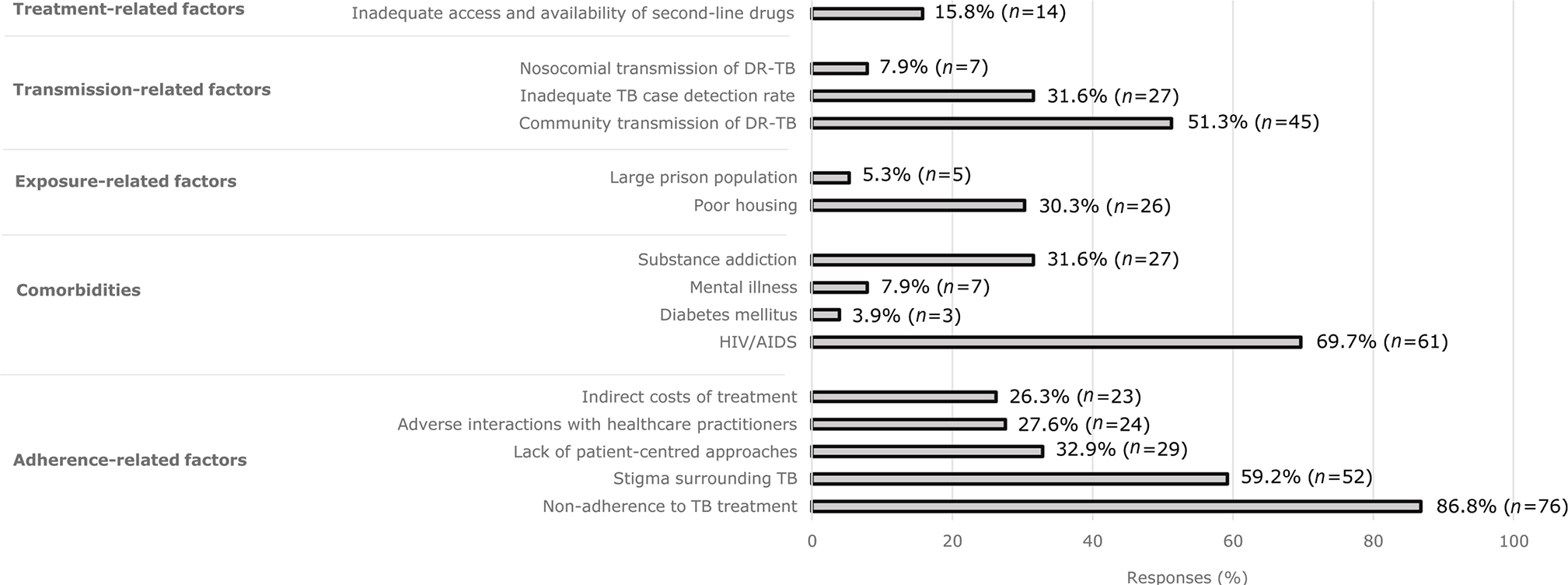 Respondents identified factors relating to treatment non-adherence, comorbid immunosuppression, community transmission, and risk of TB exposure to be major contributors to the prevalence of DR-TB in South Africa (Fig. 2).