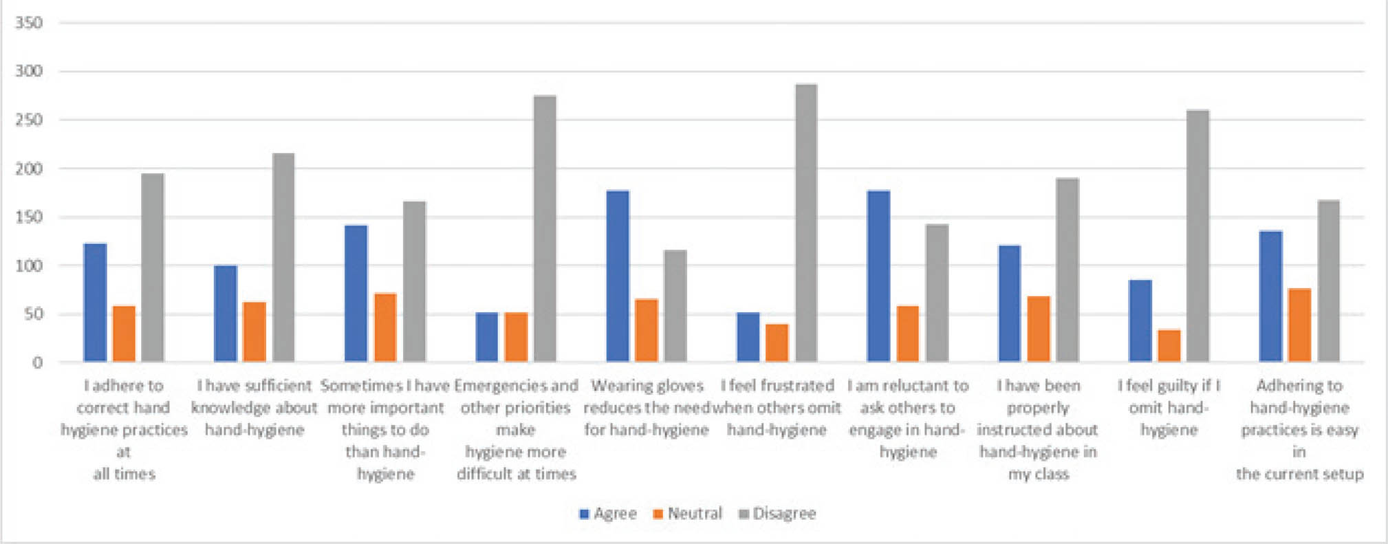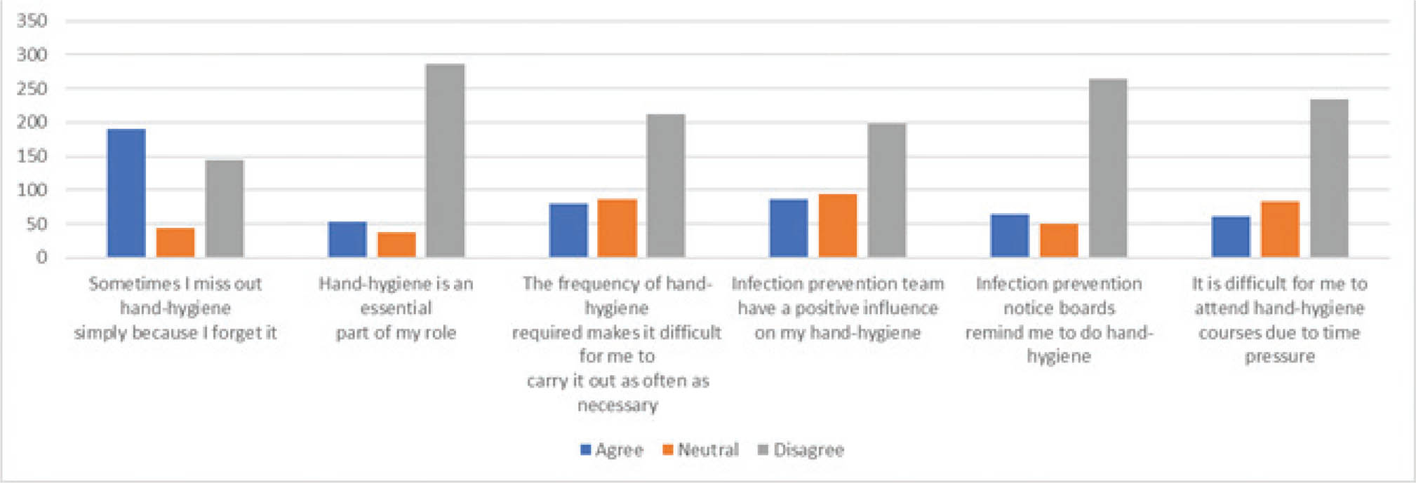 Fig. 1. Attitude toward hand-hygiene among healthcare workers. Vertical (Y) axis represents the number of respondents.