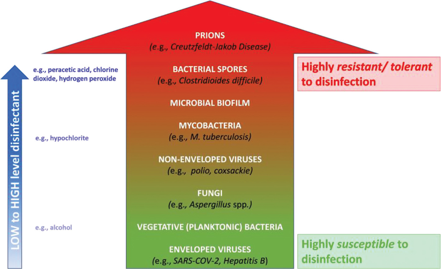 Fig. 1. Microbial tolerance to disinfectants (green = most susceptible; red = most resistant/tolerant). High level disinfectants such as chlorine dioxide, peracetic acid, and hydrogen peroxide are effective against the most resistant/tolerant bacterial forms (i.e. spores, mycobacteria, and biofilm). Note: the most resistant infectious particles (prions) require prolonged sterilization for inactivation.