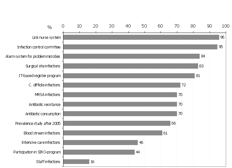 Infection control (IC) in hospitals depends on adequate human resources and organization. The aim of the study was to assess the IC resources and activities in Finnish acute care hospitals. A questionnaire covering information on hospital characteristics, IC staff and surveillance activities in 2008 was mailed to all Finnish acute care hospitals. All 57 (100%) hospitals responded. Of the hospitals, 70% had infectious disease specialists and 37% had clinical microbiologists who participated in the IC. Most of the hospitals (88%) had trained IC nurses. The median number of hospital beds per full-time equivalent ICN was 257 (range, 87-770). The IC staff had limited secretarial and IT-support. Most hospitals (95%) had IC committees as well as a link nurse system (96%), and they all implemented incidence surveillance at least in one specialty. In comparison with the results from our previous study in 2000, the ICN to bed ratio has improved (2000: range 394-953 beds/ICN). Now that the situation with IC staff seems better, the focus could be shifted to additional training and an evaluation of the curriculum of the ICNs.Downloads